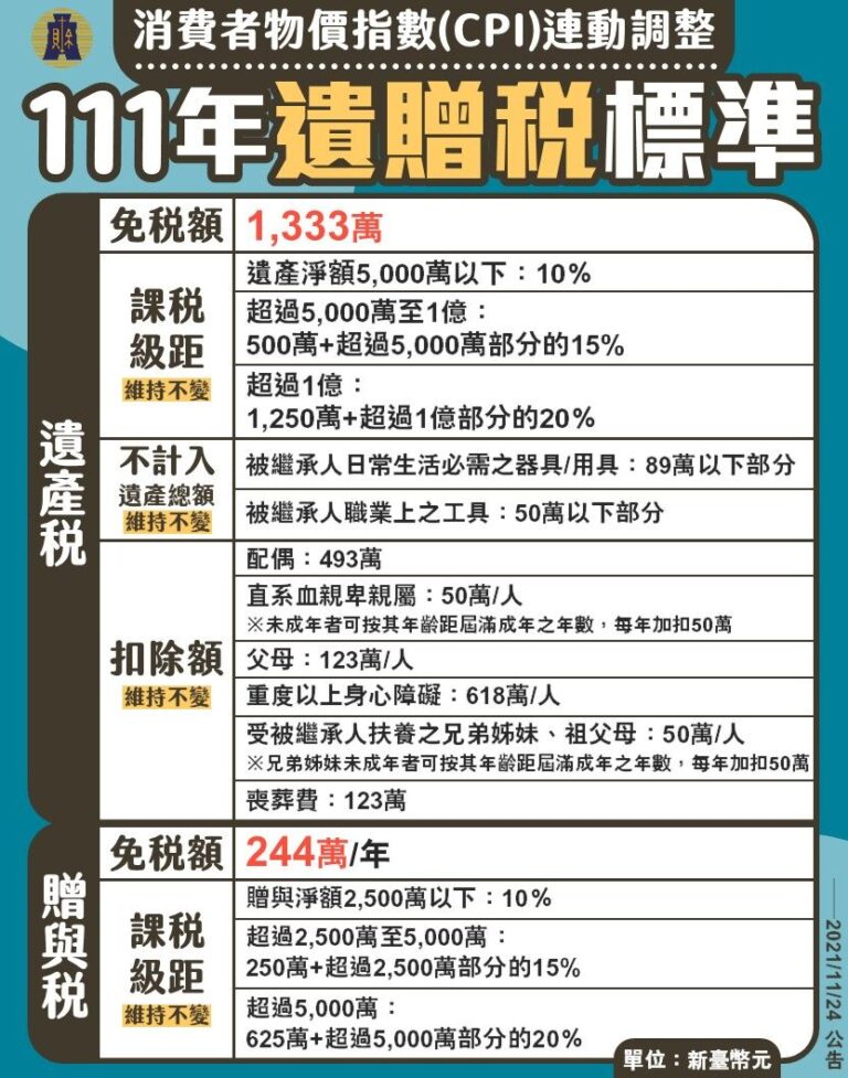 遺產稅及贈與稅免稅額調高 自民國111年起…